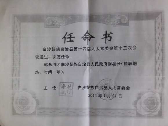 2014.01韩永胜老师----被任命为白沙黎族自治县人民政府副县长.jpg