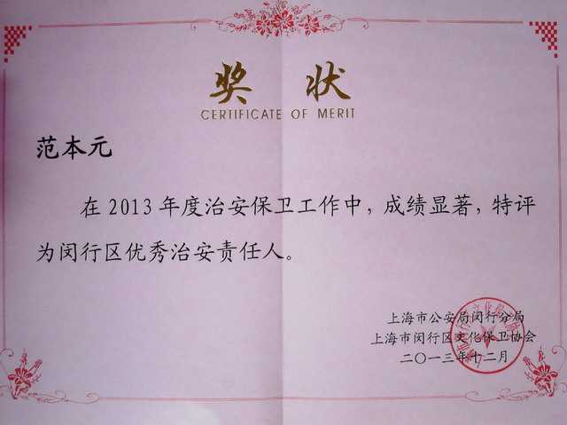 范本元----评为2013年度闵行区优秀治安责任人(奖状)