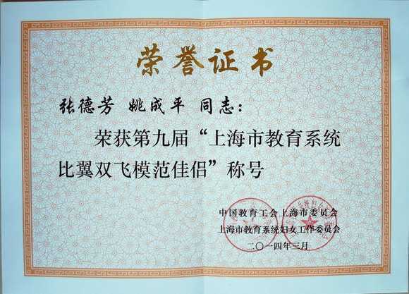 2014.03张德芳 姚成平----获第九届“上海市教育系统比翼双飞模范佳侣”称号(证书).jpg