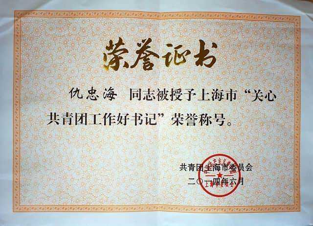 2014.06仇忠海----被授予上海市“关心共青团工作好书记”荣誉称号(证书)