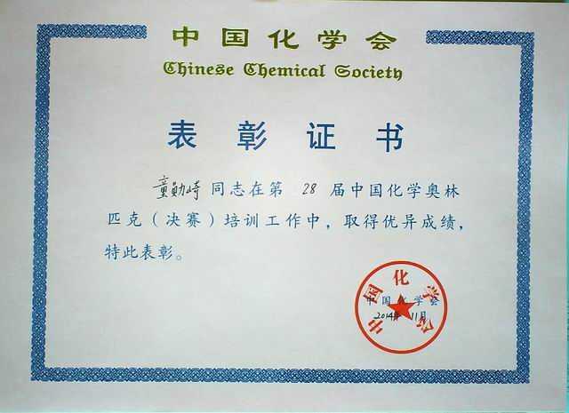 2014.11童勋崎----在第28届中国化学奥林匹克(决赛)培训工作中取得优异成绩(证书)