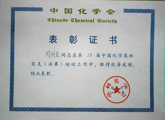 2014.11周国亮----在第28届中国化学奥林匹克(决赛)培训工作中取得优异成绩(证书)