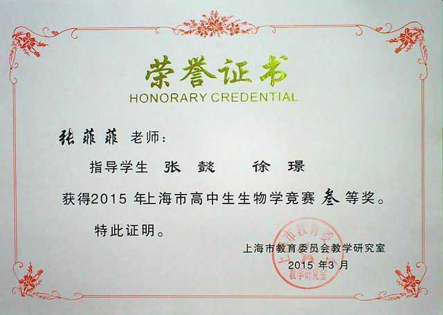 张菲菲----指导的张懿、徐璟同学获2015年上海市高中生生物学竞赛三等奖(证书)