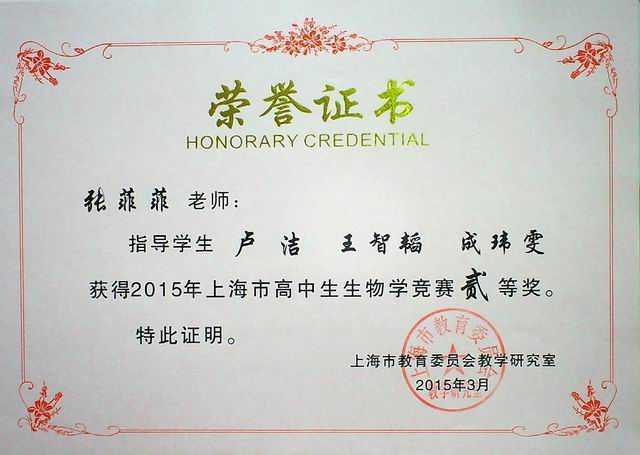 张菲菲----指导的卢洁、王智韬、成玮雯同学获2015年上海市高中生生物学竞赛二等奖(证书)