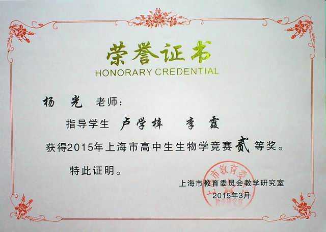 杨光----指导的卢学梓、李霞同学获2015年上海市高中生生物学竞赛二等奖(证书)