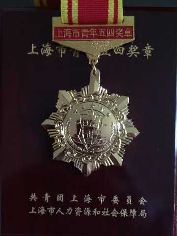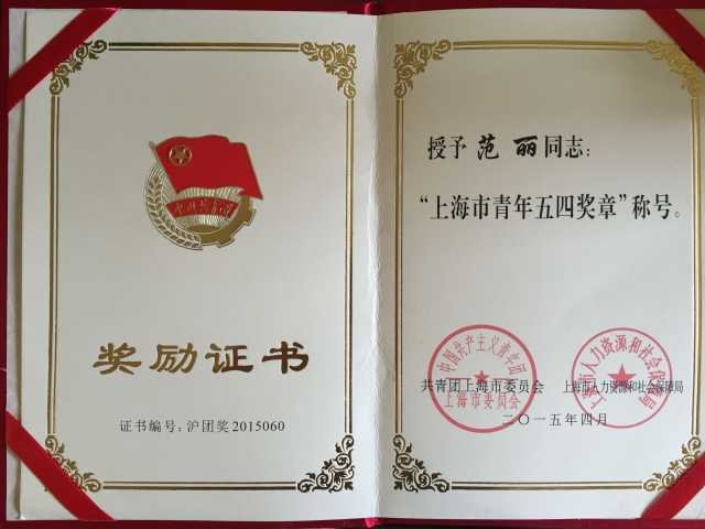 范丽----被授予“上海市青年五四奖章”荣誉称号(证书; 奖牌)