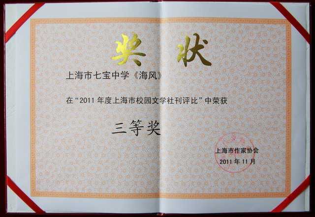 七宝中学《海风》获2011年度上海市校园文学社刊评比三等奖