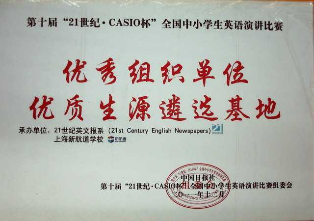 七宝中学被授予第十届21世纪CASIO杯全国中小学生英语演讲比赛(上海赛区)“优秀组织单位和优质生源遴选基地”